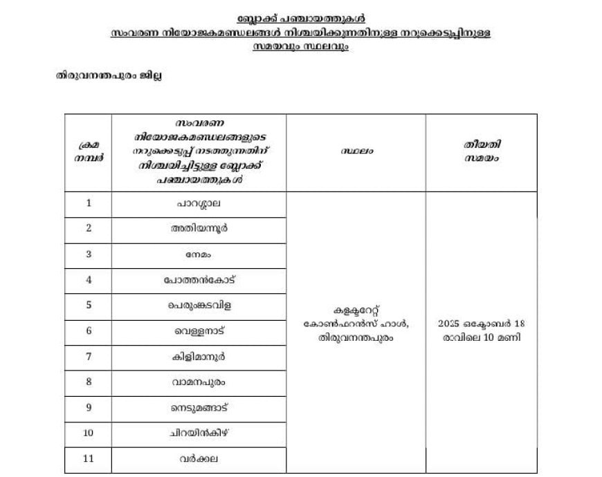 സംസ്ഥാനത്തെ ബ്ലോക്ക് പഞ്ചായത്തുകളിലേക്ക് 2025-ൽ നടക്കുന്ന പൊതു തിരഞ്ഞെടുപ്പിൽ ഓരോ ബ്ലോക്ക് പഞ്ചായത്തിലും, പട്ടികജാതികൾക്കും പട്ടികവർഗ്ഗങ്ങൾക്കും സ്ത്രീകൾക്കും സംവരണം ചെയ്തിട്ടുള്ളത്രയും എണ്ണം സ്ഥാനങ്ങൾ ആവർത്തന ക്രമമനുസരിച്ച് ഏത് നിയോജകമണ്ഡലങ്ങൾക്കാണ് നൽകേണ്ടതെന്ന് നറുക്കെടുപ്പിലൂടെ തീരുമാനിക്കുന്നതിനായി 2025 ഒക്ടോബർ 18 -)0 തീയതി രാവിലെ 10 മണിക്ക് ഇതോടൊപ്പം ചേർത്തിട്ടുള്ള സ്ഥലത്തു വെച്ച് നറുക്കെടുപ്പ് നടത്തുന്നതിന് അതത് ജില്ലയിലെ ജില്ലാ തിരഞ്ഞെടുപ്പ് ഉദ്യോഗസ്ഥനെ (ജില്ലാ കളക്ടറെ), അധികാരപ്പെടുത്തിക്കൊണ്ട് 1994-ലെ കേരള പഞ്ചായത്ത് രാജ് ആക്ട് 10- വകുപ്പ് (2.എ) ഉപവകുപ്പ് പ്രകാരം സംസ്ഥാന തിരഞ്ഞെടുപ്പ് കമ്മീഷൻ ഇതിനാൽ വിജ്ഞാപനം പുറപ്പെടുവിക്കുന്നു.